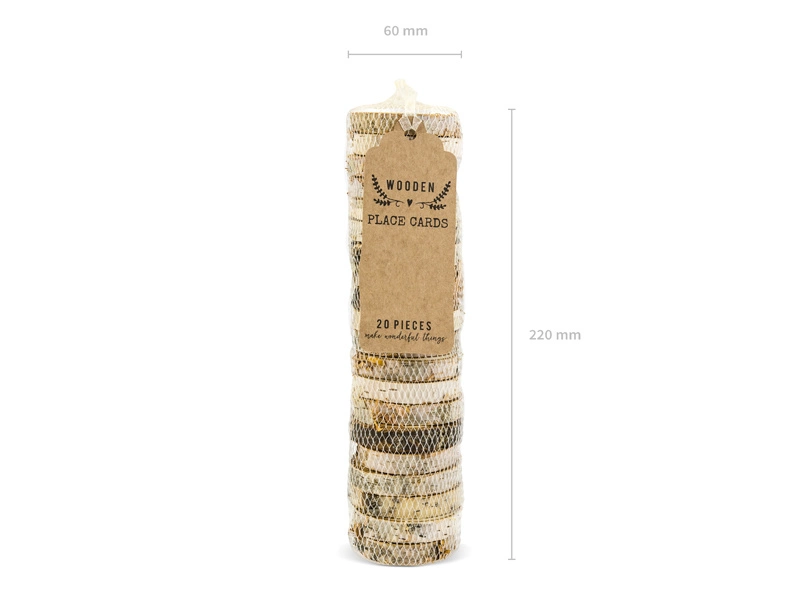 - Drewniane wizytówki na stół, średnica ok. 4,5-6,5 cm, wysokość ok. 1 cm. (1 op. / 20 szt.)