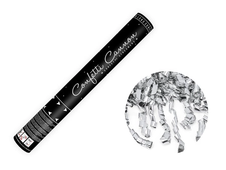 - Tuba strzelająca długimi metalicznymi serpentynami w kolorze srebrnym, długość 40 cm.