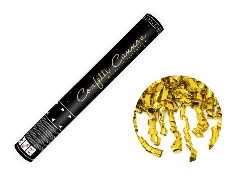 - Tuba strzelająca długimi metalicznymi serpentynami w kolorze złotym, długość 40 cm.