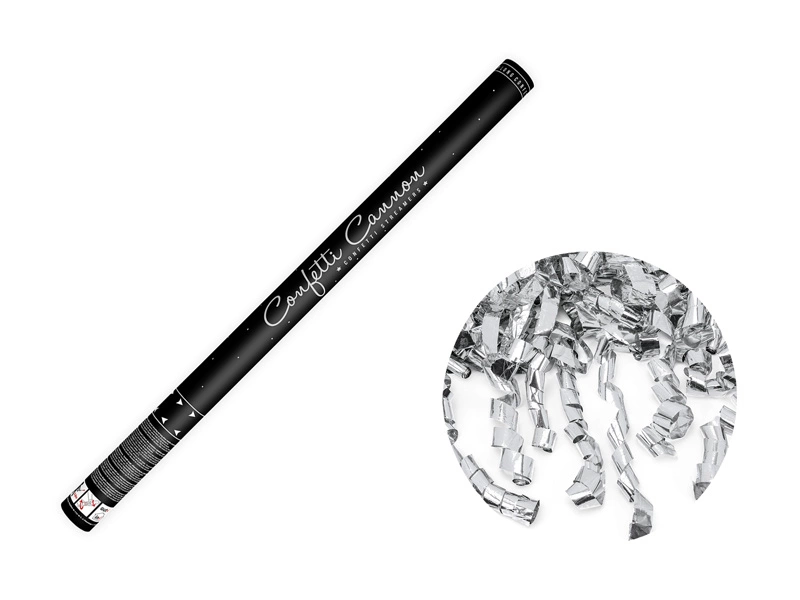 - Tuba strzelająca długimi metalicznymi serpentynami w kolorze srebrnym, długość 80 cm.