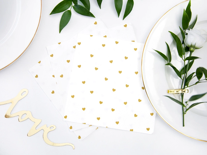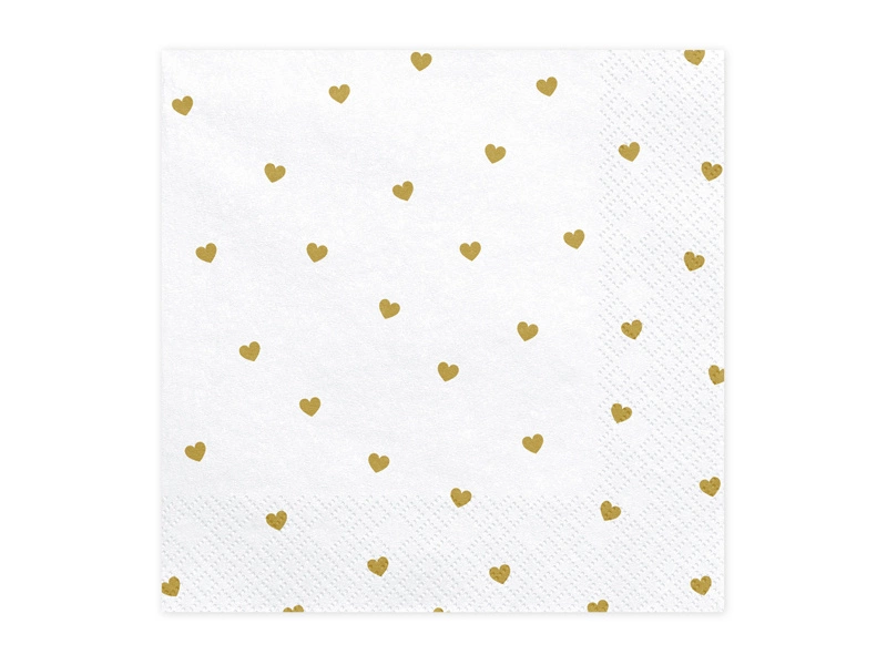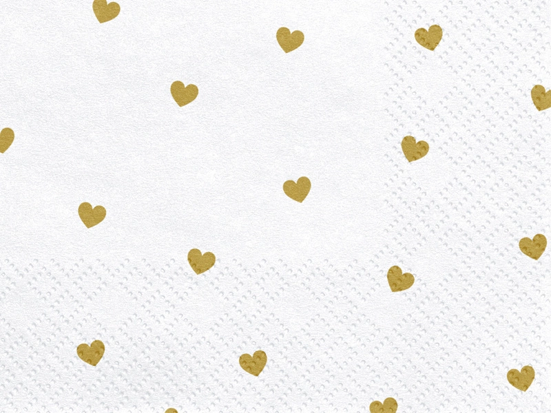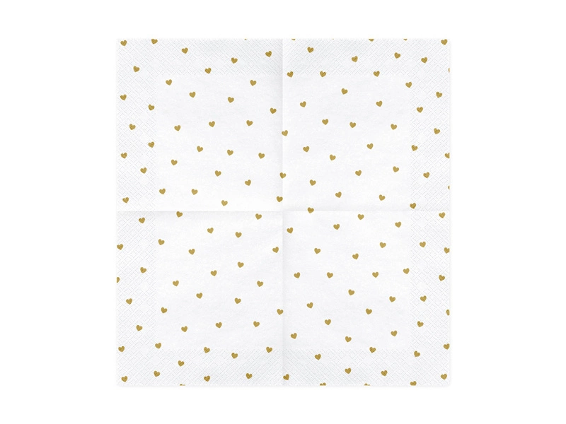 - Serwetki papierowe Serca w kolorze białym ze złotym nadrukiem, wymiary po rozłożeniu ok. 33 x 33 cm, wymiary po złożeniu ok. 16,5 x 16,5 cm. (1 op. / 20 szt.)