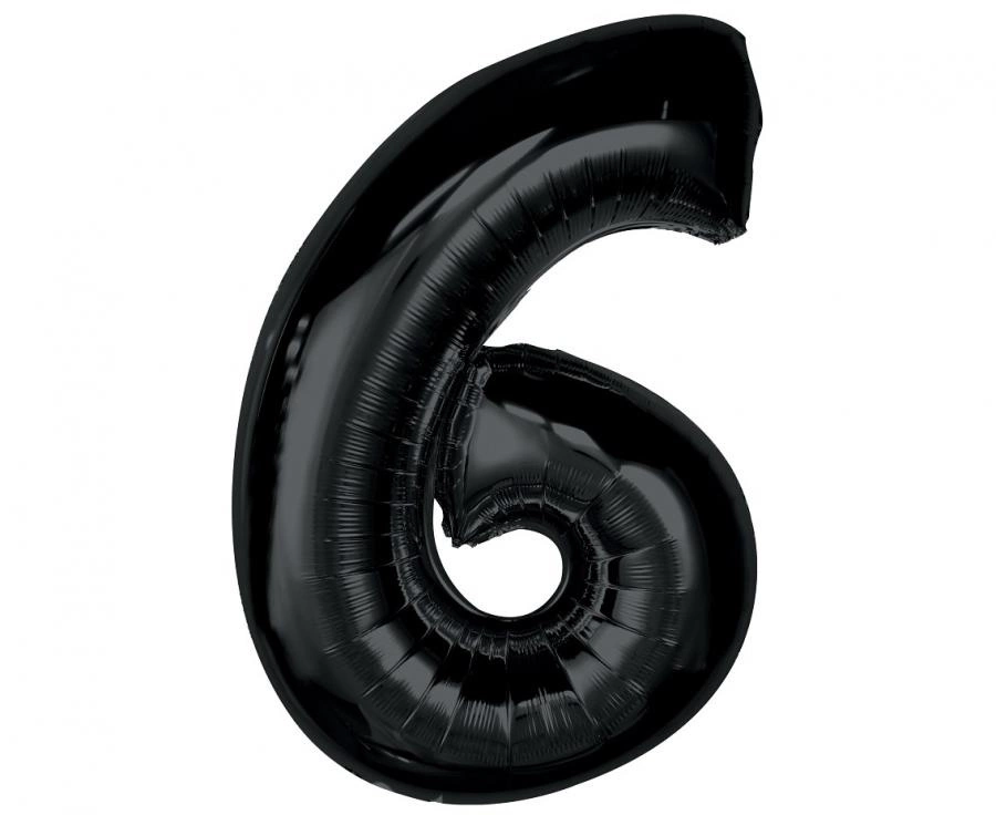 Balon foliowy w kształcie cyfry 6, wys. 92 cm, kolor czarny, producent GoDan. Przeznaczony do napełnienia helem — przy napełnieniu powietrzem nie będzie się unosić. Nadaje się do dekoracji na urodziny, rocznice, wieczory panieńskie oraz jako element tła do zdjęć.