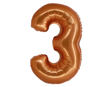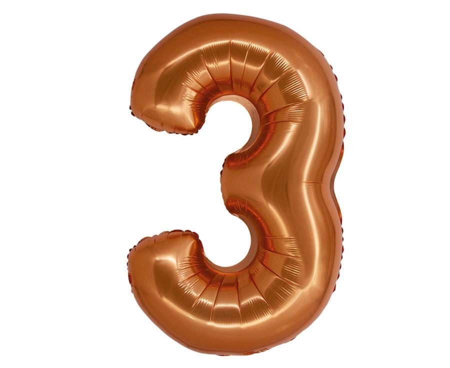 Balon foliowy w kształcie cyfry 3 w kolorze miedzianym, rozmiar po napompowaniu 76 cm. W opakowaniu 1 sztuka z zaworem samozamykającym. Przeznaczony do napełnienia helem — napełniony powietrzem nie będzie się unosić. Nadaje się na urodziny, rocznice i wieczory panieńskie.