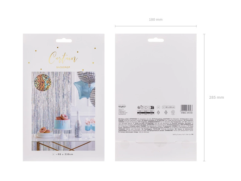 - Kurtyna Party w kolorze holograficznym, szerokość ok. 90 cm, wysokość ok. 250 cm.
