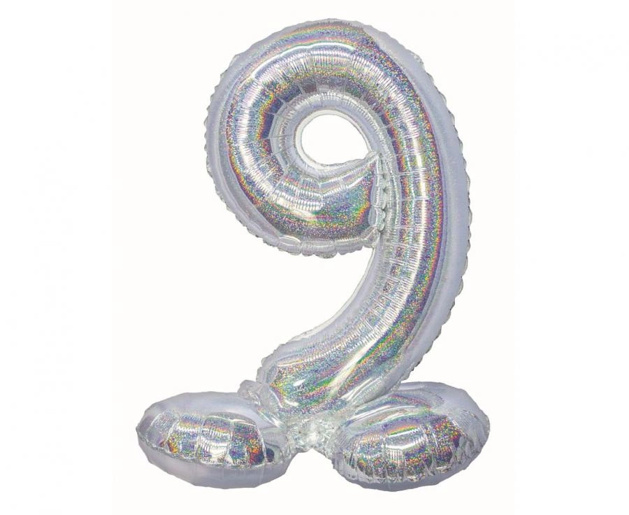 Balon foliowy w kształcie cyfry 9, stojący, o wysokości 72 cm, holograficznie srebrny. Przeznaczony do napełnienia powietrzem (sprzedawany nienapompowany). Nadaje się na urodziny, jubileusze, rocznice, wieczory panieńskie oraz jako element tła fotograficznego.