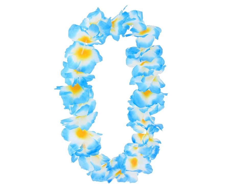 Naszyjnik hawajski (lei) w kolorze niebiesko-białym, średnica 45–50 cm, wykonany z poliestru. Przeznaczony jako akcesorium na imprezy tematyczne: Aloha party, wieczór panieński, urodziny, baby shower, święta czy karnawał. Lekki, łatwy do założenia i wielokrotnego użycia.