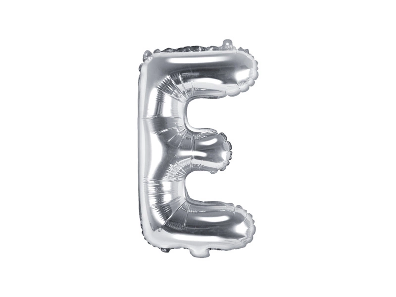 - Balon foliowy metalizowany Litera ''E'' w kolorze srebrnym, wysokość przed napompowaniem ok. 40 cm (16''), wysokość po napompowaniu ok. 35 cm (14''). Do napomowania powietrzem.