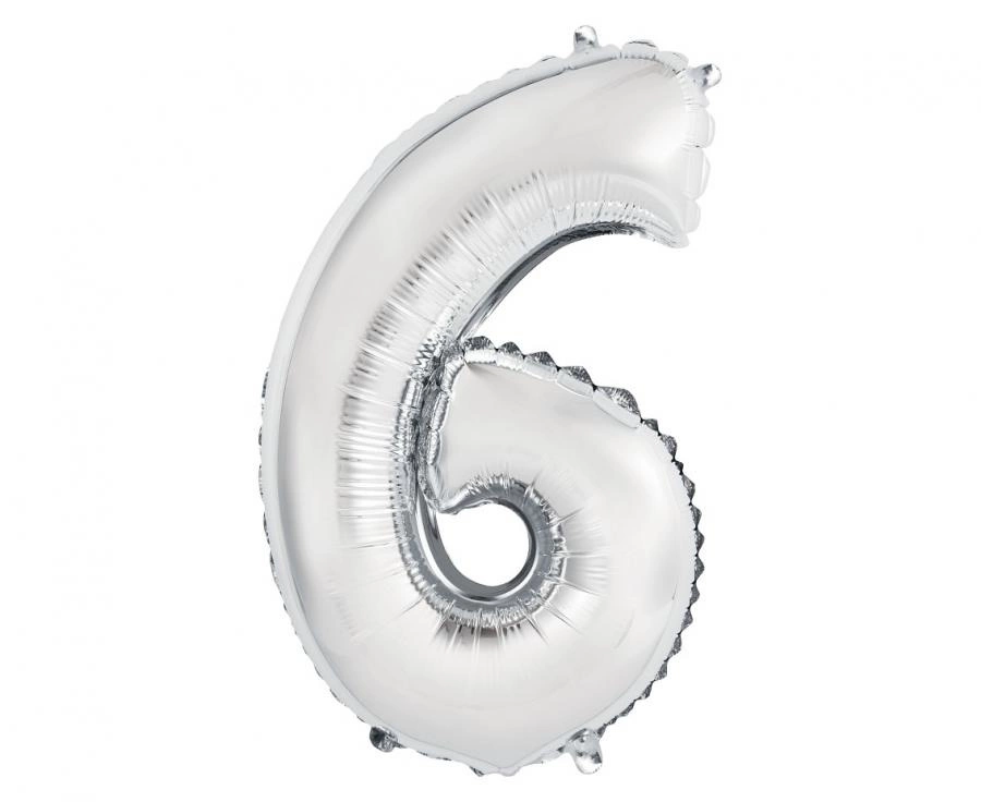 Srebrny balon foliowy w kształcie cyfry 6 o rozmiarze po napompowaniu 35 cm. Produkt sprzedawany pojedynczo, przeznaczony do napełnienia powietrzem (nie unosi się). Wyposażony w zawór samozamykający — praktyczny wybór na urodziny, rocznice, wieczory panieńskie i jako element tła do zdjęć.