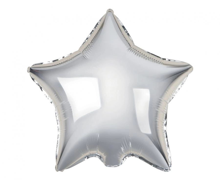 Foliowy balon w kształcie gwiazdy, srebrny, rozmiar nominalny 19'' (44 cm). Produkt przeznaczony do napełnienia helem lub powietrzem (przy napełnieniu helem balon się unosi). Sprawdza się jako pojedynczy akcent dekoracyjny na wesela, urodziny, baby shower, wieczory panieńskie, Walentynki, Boże Narodzenie i Halloween.
