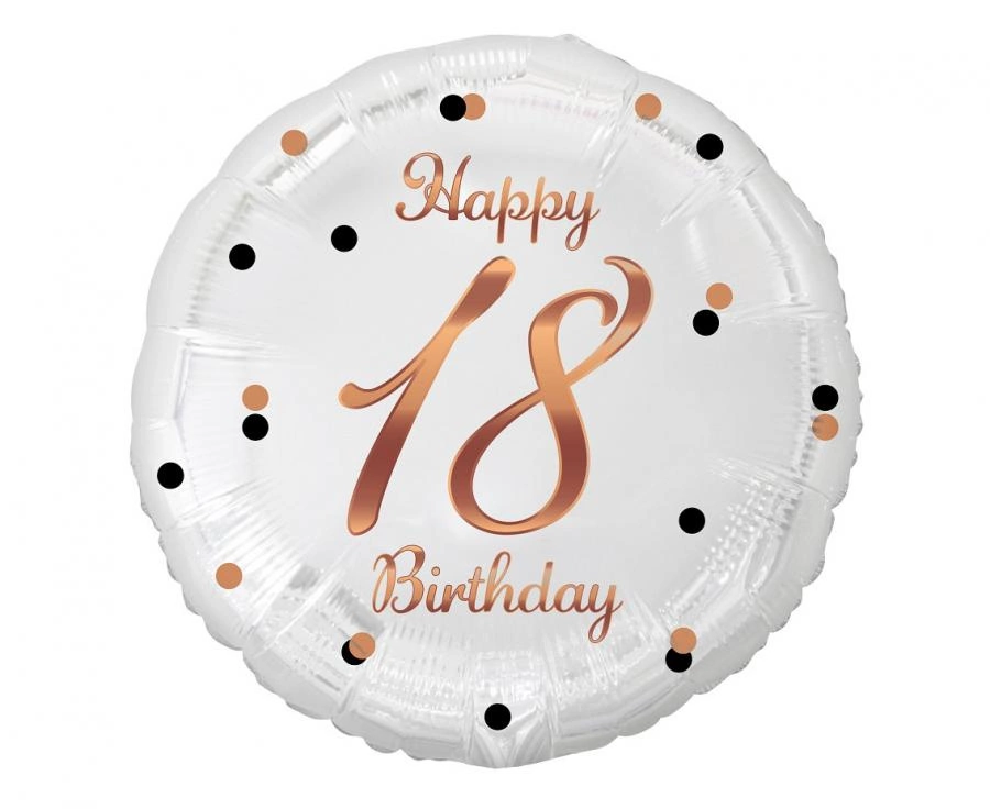 Balon foliowy okrągły 45 cm (18") w kolorze białym z nadrukiem „Happy 18 Birthday” w różowo‑złotym odcieniu. Produkt przeznaczony do napełnienia helem — idealny na 18. urodziny jako pojedynczy akcent dekoracyjny, element tła do zdjęć lub uzupełnienie bukietu balonowego.