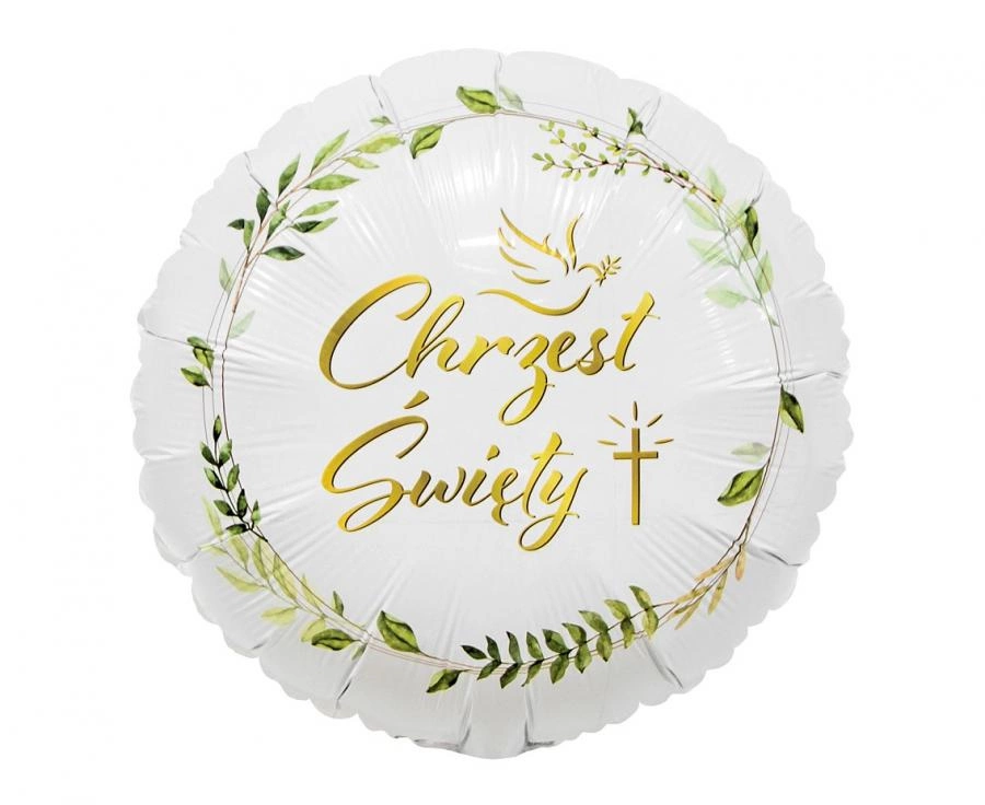 Balon foliowy „Chrzest Święty” o średnicy 36 cm (18") z nadrukiem gołąbka i krzyża. Określony kolor: biały ze złotymi i zielonymi elementami. Produkt przeznaczony głównie do dekoracji wnętrz podczas uroczystości chrztu — jako pojedynczy akcent, element bukietu balonowego lub tło do zdjęć.