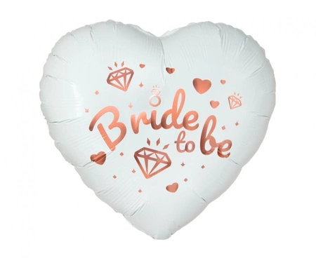 Balon foliowy w kształcie serca „Bride To Be”, kolor biały z napisem w kolorze różowego złota. Rozmiar 18 cali (około 46 cm). Przeznaczony głównie na wieczór panieński, ale sprawdzi się też na weselu, sesji zdjęciowej czy przyjęciu z motywem ślubnym.