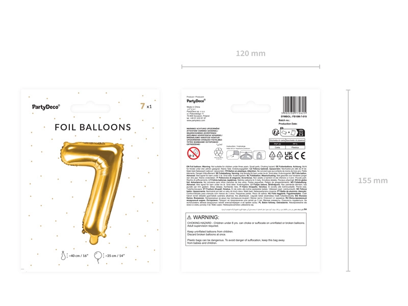 - Balon foliowy metalizowany Cyfra ''7'' w kolorze złotym, rozmiar przed napompowaniem ok. 40 cm (16''), rozmiar po napompowaniu ok. 35 cm (14''). Do napomowania powietrzem.