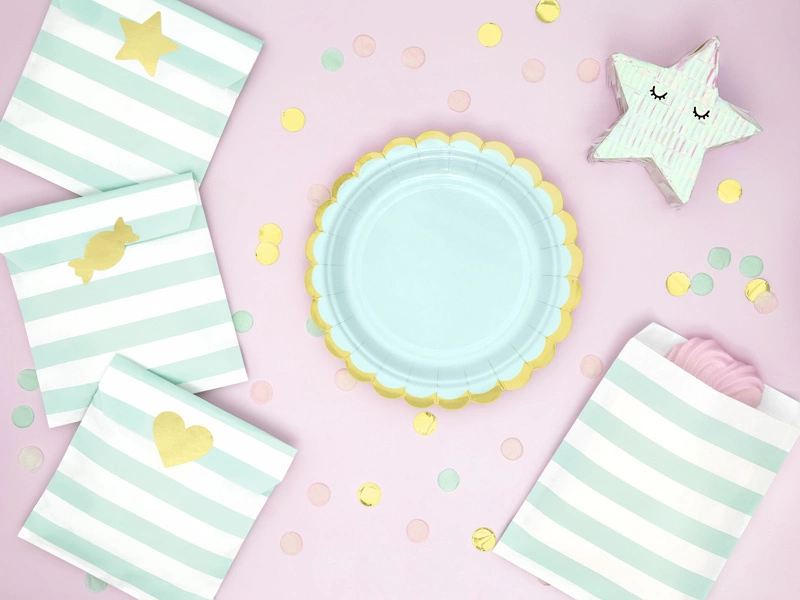- Talerzyki papierowe w kolorze miętowym ze złotymi metalizowanymi brzegami, średnica ok. 18 cm. (1 op. / 6 szt.)