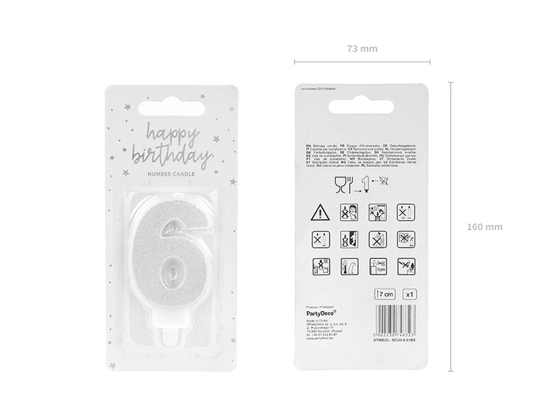 - Świeczka urodzinowa Cyferka 6 w kolorze srebrnym brokatowym, rozmiar ok. 7 cm.