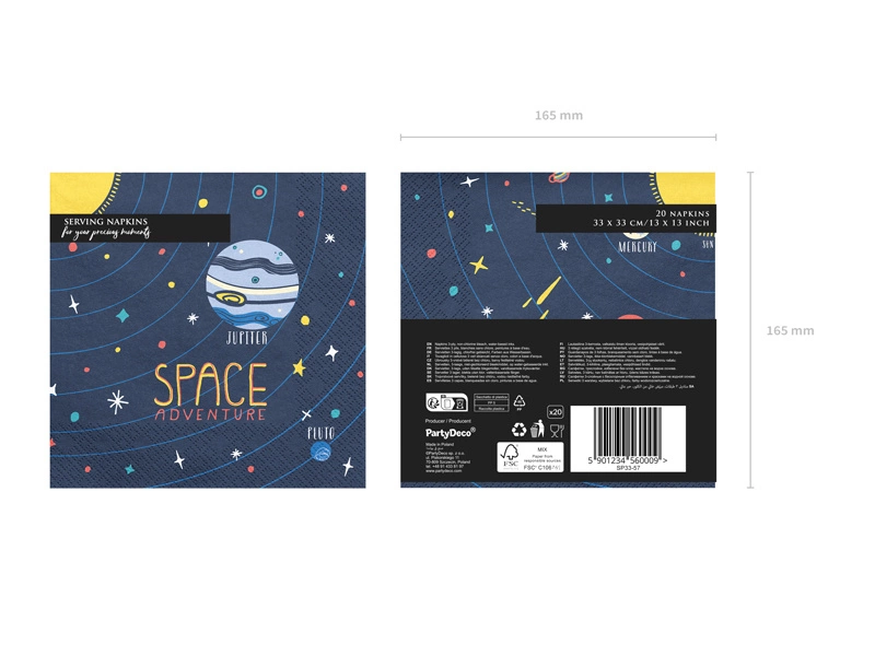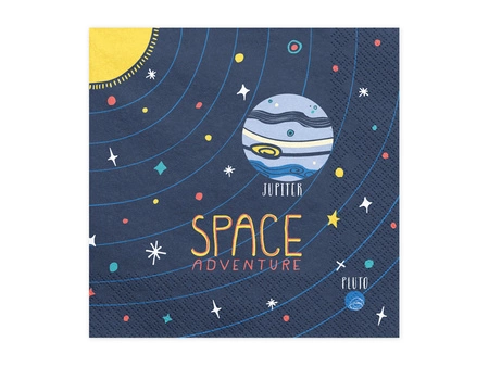- Serwetki papierowe Kosmos w kolorze granatowym z nadrukiem, wymiary po rozłożeniu ok. 33 x 33 cm, wymiary po złożeniu ok. 16,5 x 16,5 cm. (1 op. / 20 szt.)