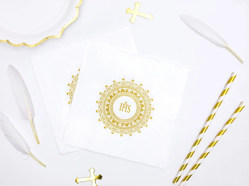 Wprowadź odrobinę luksusu i wyjątkowości do każdej uroczystości komunijnej z naszymi serwetkami komunijnymi z nadrukiem IHS. Te eleganckie, białe serwetki ze złotym nadrukiem doskonale podkreślą uroczysty nastrój i staną się nieodłącznym elementem dekoracji stołu.