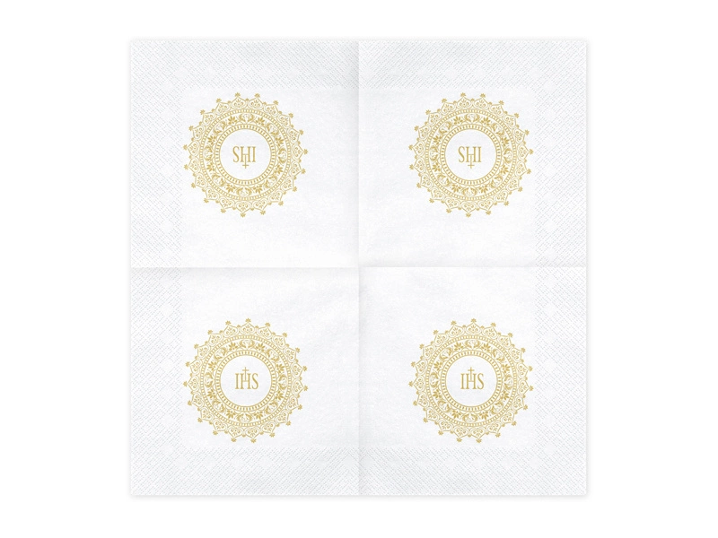- Serwetki komunijne papierowe białe ze złotym nadrukiem IHS, wymiary po rozłożeniu ok. 33 x 33 cm, wymiary po złożeniu ok. 16,5 x 16,5 cm. (1 op. / 20 szt.)