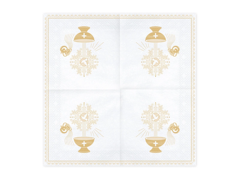 - Serwetki Chrzest Święty papierowe białe ze złoto-różowym nadrukiem, wymiary po rozłożeniu ok. 33 x 33 cm, wymiary po złożeniu ok. 16,5 x 16,5 cm. (1 op. / 20 szt.)