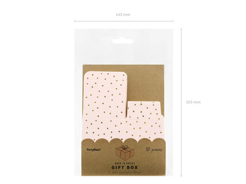 - Pudełeczka w kolorze jasnoróżowym w złote kropki, wymiary po złożeniu ok. 6 x 3.5 x 5.5 cm. (1 op. / 10 szt.)