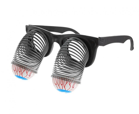 Okulary „Wychodzące gały” to plastikowy gadżet imprezowy z czarnymi oprawkami i ruchomymi oczami zawieszonymi na sprężynkach. Wymiary: szer. 12 cm, nauszniki 13 cm, szer. oprawek 0,5 cm. Polecane na Halloween, fotobudkę, wieczór panieński, urodziny i imprezy tematyczne.