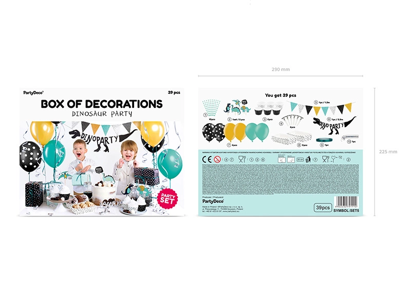 - Zestaw dekoracji party - Dinozaury, zestaw zawiera: baner Dino Party (1 szt.), girlandę papierową (1 szt.), papilotki na muffinki (6 szt.), topper na tort (5 szt.), foremki na słodycze (2 szt.), słomki (10 szt.), srebrne gwizdki (6 szt.), balony (mix wzor