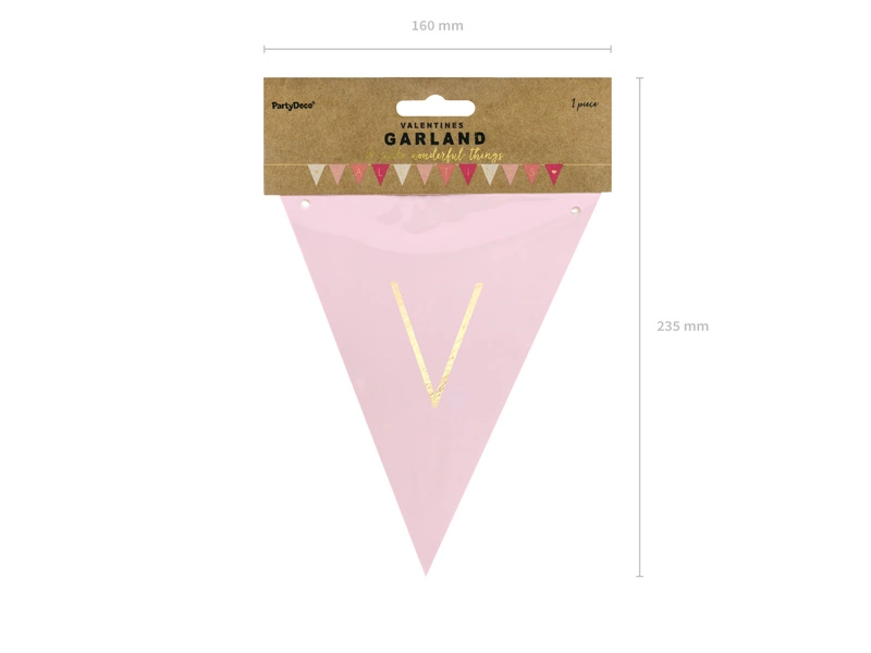 - Girlanda flagietki, mix kolorów ze złotym napisem Valentines, do samodzielnego złożenia, zestaw zawiera 12 flagietek i ok. 3 m złotego sznurka, wymiary po złożeniu: wysokość ok. 18 cm, długość ok. 2,1 m.