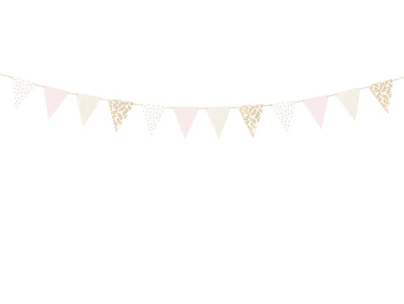 - Girlanda flagietki, mix kolorów ze złotym nadrukiem, do samodzielnego złożenia, zestaw zawiera 12 flagietek i ok. 3 m złotego sznurka, wymiary po złożeniu: wysokość ok. 18 cm, długość ok. 2,1 m.