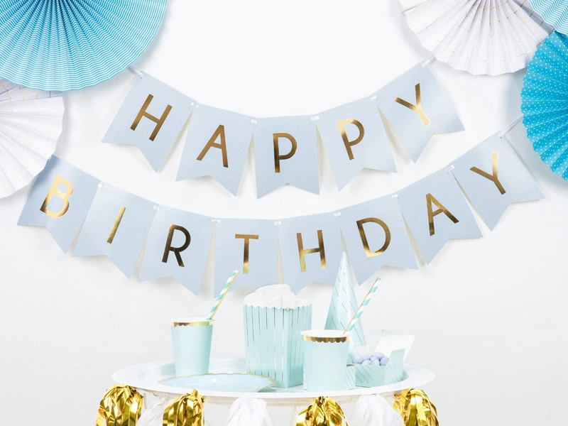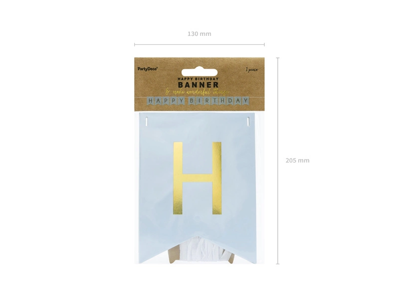 - Baner w kolorze jasnoniebieskim ze złotym napisem Happy Birthday, do samodzielnego złożenia, zestaw zawiera literki i ok. 2,5 m białej tasiemki, wymiary po złożeniu: wysokość ok. 15 cm, długość ok. 175 cm.