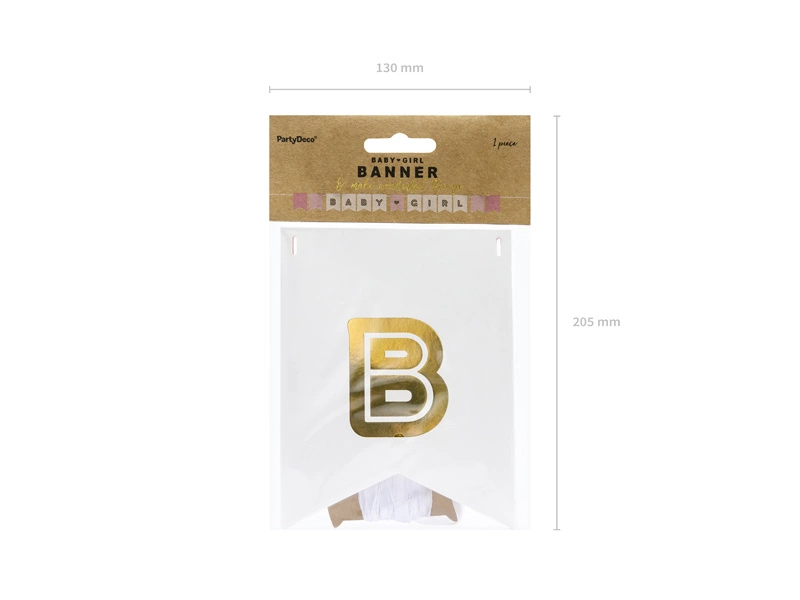 - Baner Baby Girl, mix kolorów ze złotym napisem, do samodzielnego złożenia, zestaw zawiera literki i ok. 2,5 m białej tasiemki, wymiary po złożeniu: wysokość ok. 15 cm, długość ok. 175 cm.