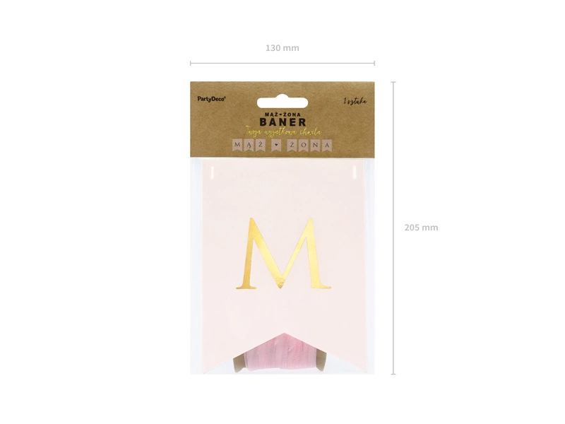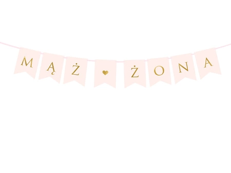 - Baner w kolorze jasnoróżowym ze złotym napisem Mąż Żona, do samodzielnego złożenia, zestaw zawiera literki i ok. 2,5 m jasnoróżowej tasiemki, wymiary po złożeniu: wysokość ok. 15 cm, długość ok. 110 cm.