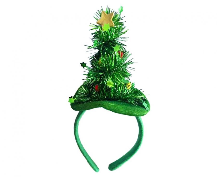 Opaska "Zielona choinka" to świąteczny gadżet na głowę z dekoracją przypominającą mini choinkę, ozdobioną kolorowymi bombkami, błyszczącymi łańcuchami i drobnymi dzwoneczkami. Rozmiar uniwersalny, 1 sztuka — przede wszystkim na imprezy bożonarodzeniowe, spotting firmowy i rodzinne spotkania.