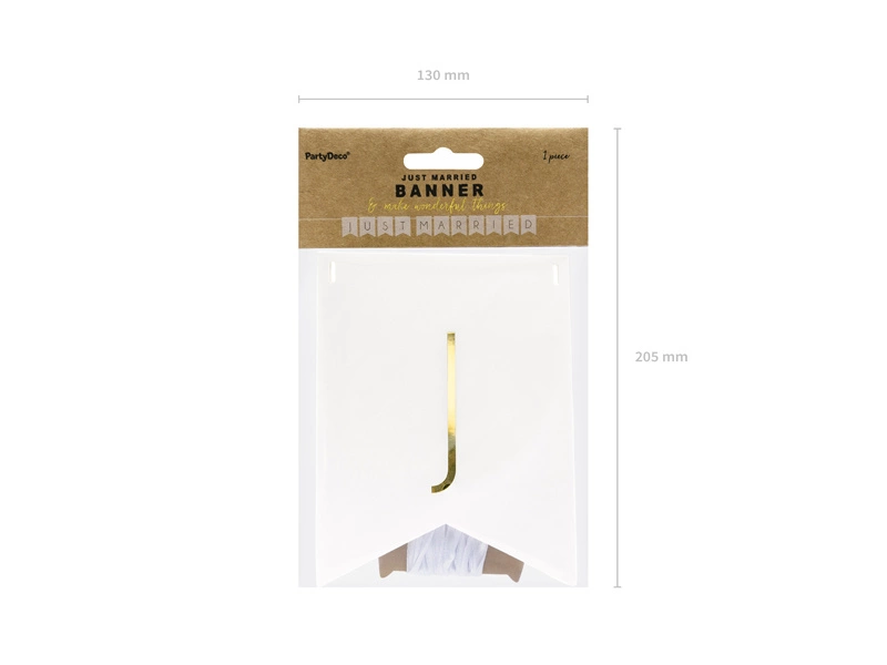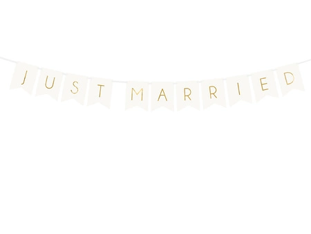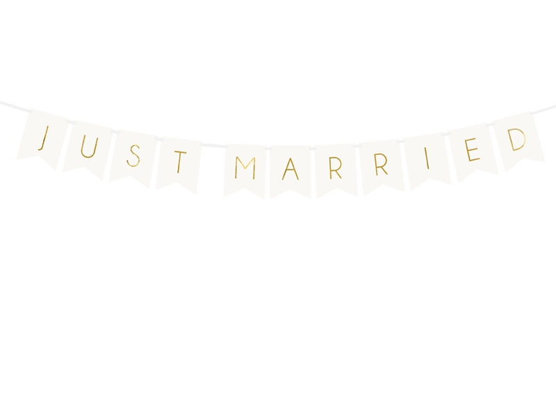 - Baner w kolorze białym ze złotym napisem Just Married, do samodzielnego złożenia, zestaw zawiera literki i ok. 2,5 m białej tasiemki, wymiary po złożeniu: wysokość ok. 15 cm, długość ok. 155 cm.
