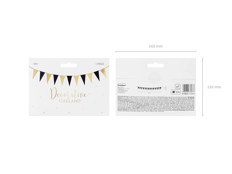 - Girlanda flagietki, mix kolorów (złoty i czarny), do samodzielnego złożenia, zestaw zawiera 14 flagietek i ok. 3 m złotego sznurka, wymiary po złożeniu: wysokość ok. 13 cm, długość ok. 2,15 m.