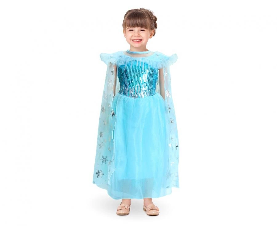 Strój dla dzieci „Błękitna Dama Dworu” (rozm. 95–110 cm). Zestaw zawiera sukienkę oraz pelerynę mocowaną na rzep. Przeznaczony na bale kostiumowe, przedstawienia szkolne, urodziny i karnawał. Podane wymiary ułatwiają dopasowanie; materiał: 100% poliester, producent: Godan.