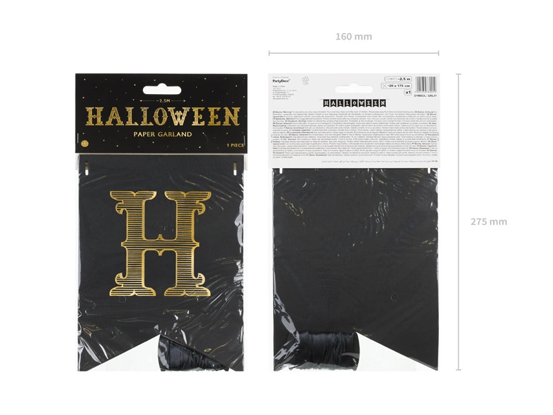 - Baner Halloween, wykonany z papieru w kolorze czarnym, do samodzielnego złożenia, zestaw zawiera literki oraz ok. 2,5 m tasiemki, wymiary po złożeniu: wysokość ok. 20 cm, długość ok. 175 cm.