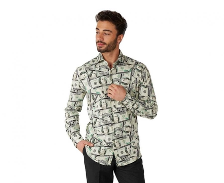 Koszula męska Cashanova z nadrukiem dolarów, rozmiar 43/44 (obwód kołnierzyka 43/44 cm, szer. pod pachami 124 cm, długość 66,5 cm). Produkt marki OppoSuits, kolor różnokolorowy. W opisie materiał: poliester. W zestawie koszula i oryginalne opakowanie.