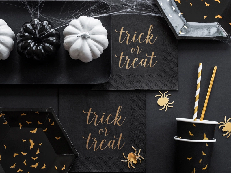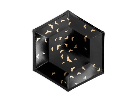 - Talerzyki papierowe Trick or Treat w kolorze czarnym ze złotym wzorem, średnica ok. 20 cm. (1 op. / 6 szt.)