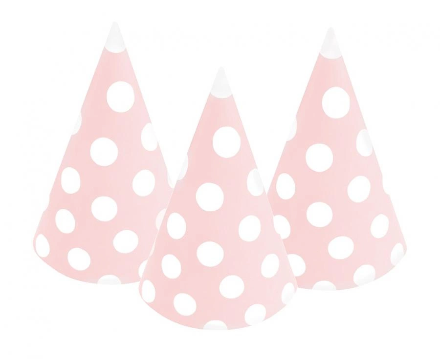 Papierowe czapeczki urodzinowe w różowym kolorze z białymi groszkami. Zestaw zawiera 6 sztuk, każda z elastyczną gumką do mocowania. Wymiary: wysokość 16 cm, średnica ok. 10 cm. Najlepiej sprawdzą się na przyjęciach urodzinowych dzieci, baby shower, wieczorach panieńskich oraz jako rekwizyt do zdjęć.