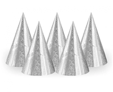 Papierowe czapeczki urodzinowe w srebrnym, holograficznym wykończeniu — zestaw 100 sztuk. Średnica pojedynczej czapeczki: 11 cm, mocowanie na elastycznej gumce. Przeznaczone na imprezy grupowe: urodziny, wieczór panieński, baby shower, Walentynki, Halloween czy świąteczne przyjęcia.