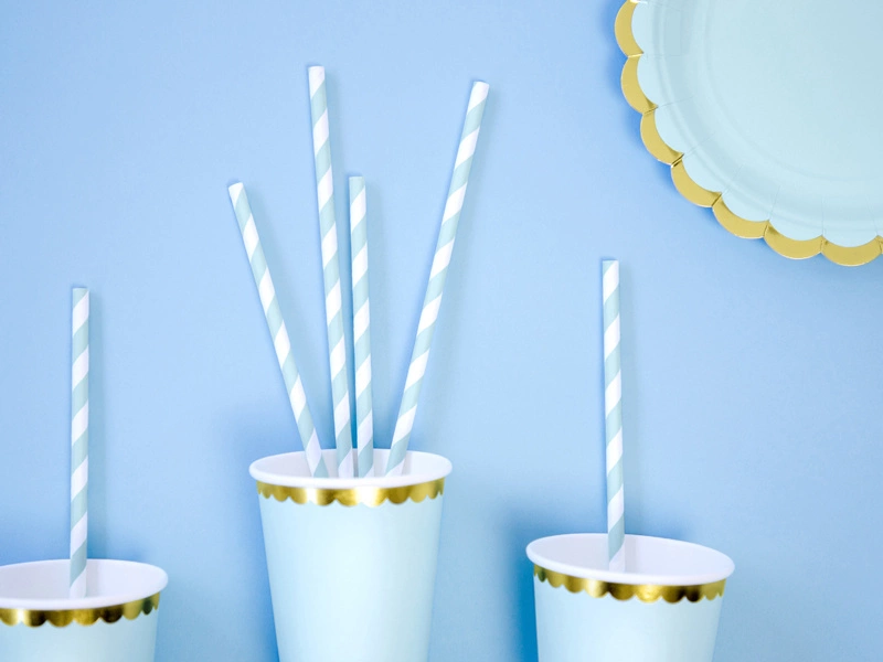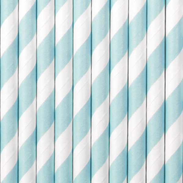- Słomki papierowe w kolorze jasnoniebieskim z białymi ukośnymi paskami, długość ok. 19,5 cm. (1 op. / 10 szt.)