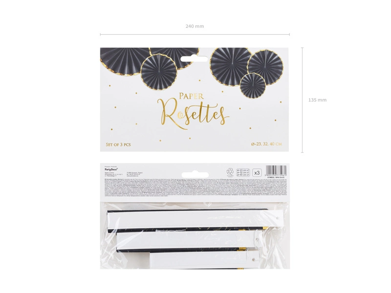 - Rozety dekoracyjne w kolorze czarnym ze złotymi brzegami, średnice po złożeniu ok. 23 cm, 32 cm i 40 cm. (1 op. / 3 szt.)