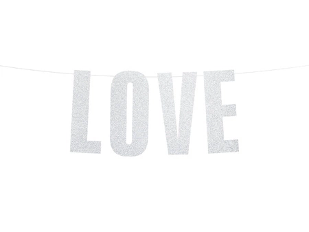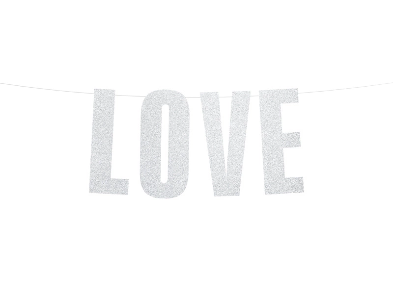 - Baner Love w kolorze srebrnym brokatowym, do samodzielnego złożenia, zestaw zawiera literki oraz ok. 2 m białego sznurka, wymiary po złożeniu: wysokość ok. 21 cm, długość ok. 55 cm.