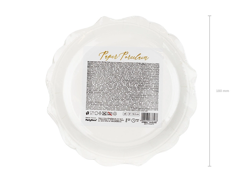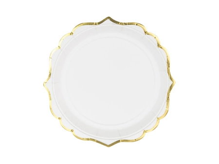 - Talerzyki papierowe w kolorze białym ze złotymi brzegami, średnica ok. 18,5 cm. (1 op. / 6 szt.)