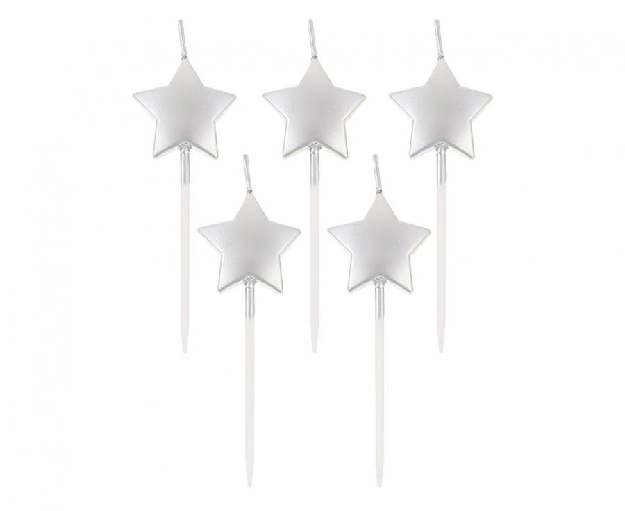 Świeczki pikery Gwiazdki, metaliczne srebrne, 5 szt.