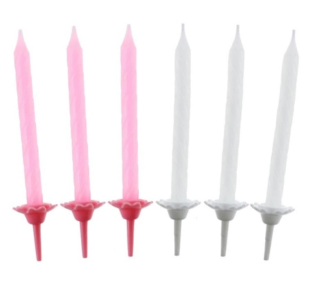 Zestaw 24 świeczek urodzinowych (kolekcja różowa, wzór nr 4) w odcieniach różu i bieli, wysokość 6 cm. W opakowaniu znajduje się 12 podstawek. Przeznaczone do dekoracji tortów i deserów — praktyczne na urodziny, baby shower, wieczór panieński oraz inne przyjęcia.