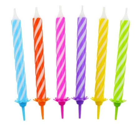 Świeczki urodzinowe o spiralnym wzorze, 12 sztuk, wysokość 8 cm (producent: Godan S.A.). Wielokolorowe świeczki z białymi paskami — kolory: niebieski, czerwony, różowy, fioletowy, żółty, zielony. Przeznaczone do dekorowania tortów, muffinek i innych wypieków podczas przyjęć.