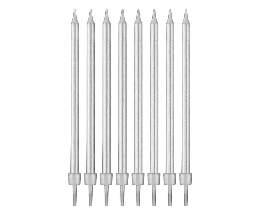 Zestaw 8 srebrnych świeczek na tort o wysokości 10 cm z 8 praktycznymi podstawkami. Przeznaczone do umieszczania na tortach i deserach podczas urodzin, wesel, baby shower, Walentynek czy świątecznych przyjęć. Umożliwiają wyraźne wyeksponowanie wypieków i porządkowe ustawienie dekoracji na stole.
