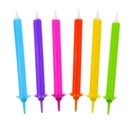 Zestaw 12 świeczek urodzinowych „Tęcza” o wysokości ok. 8 cm i średnicy ok. 8 mm, w sześciu kolorach: niebieski, fioletowy, różowy, czerwony, żółty, zielony. Przeznaczone do dekoracji tortów i ciast na urodziny, baby shower, wieczór panieński i inne przyjęcia; w zestawie znajdują się podstawki.