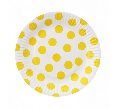 Papierowe talerzyki o średnicy 18 cm, białe z żółtymi groszkami, 6 sztuk w opakowaniu. Przeznaczone do serwowania przekąsek, deserów i porcji ciasta na przyjęciach takich jak urodziny, baby shower, wieczór panieński czy piknik. Jednorazowe i lekkie — ułatwiają podawanie i sprzątanie po imprezie.
